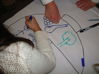 Como suele pasar, después de eso hicimos diferentes juegos para conocernos mejor. Hicimos un corro e íbamos diciendo nuestro nombre y el de la derecha acompañado con un ritmo de palmas. Después nos pidieron hacer un cartel con cinco partes: algo que nos representa, algo que nos gusta, algo que no, una pequeña frase que nos identifique y por último lo que esperamos de la visita. Os dejo una foto para que veáis nuestro proyecto en proceso.